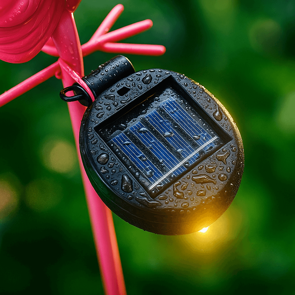• Zonnepaneel: Geïntegreerd naast de flamingo, laadt de lamp op