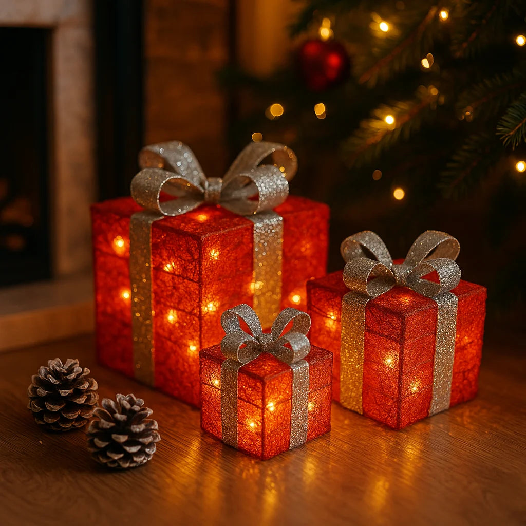 De warme LED-verlichting straalt door de dieprode structuur en wordt omlijst door glanzende zilveren linten.